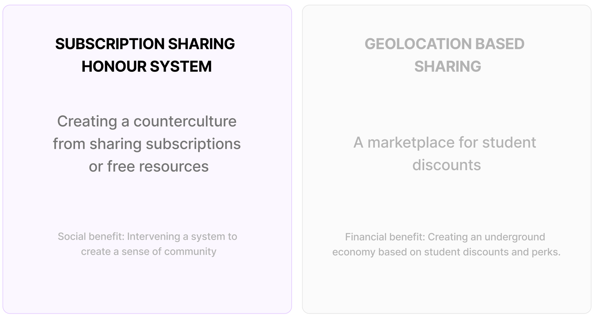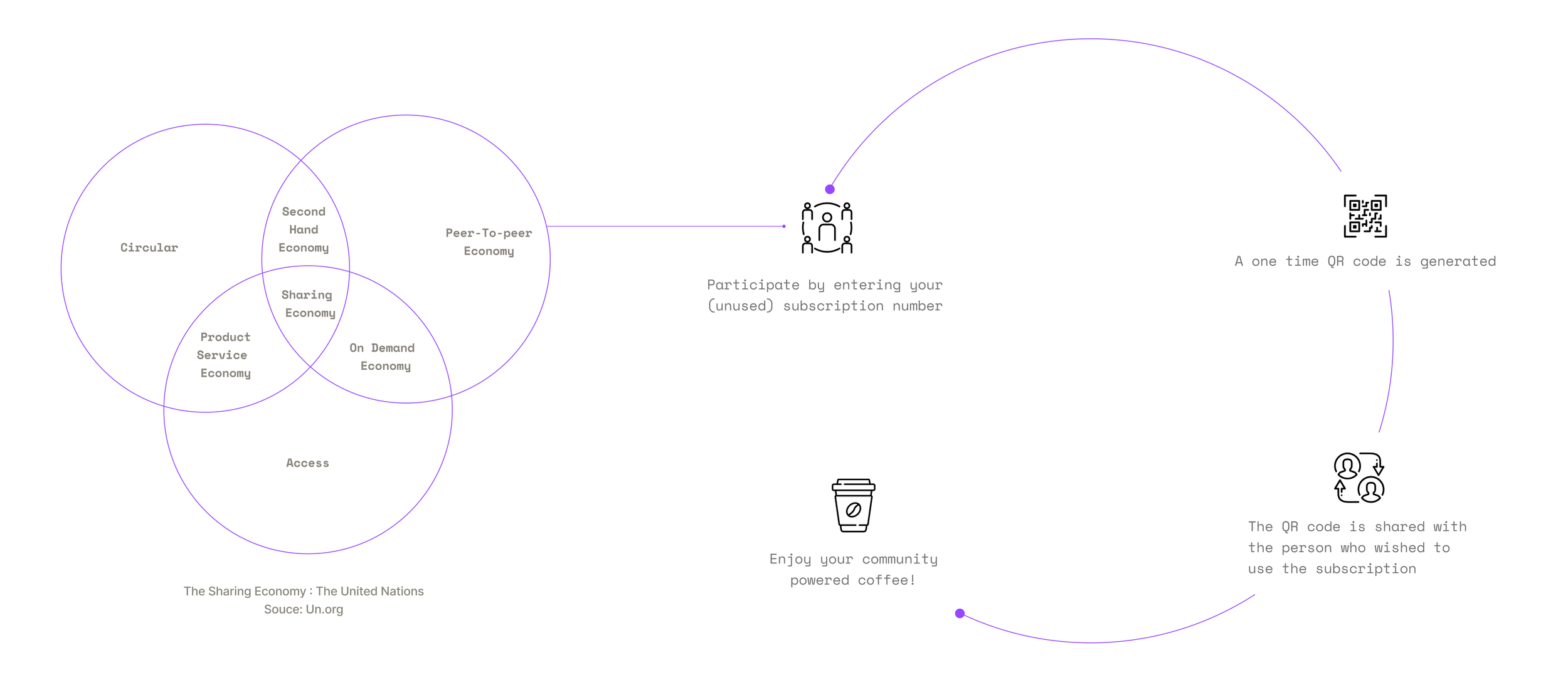 By referencing the UN's sharing economy diagram, our group developed a service model focusing on subscription-sharing through an honour system. This allowed us to extract certain benefits from retail subscription and discount programs.